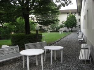 居室のある一号館。先ほどの中庭より一段高い位置にある。