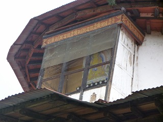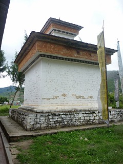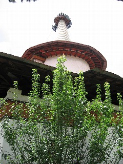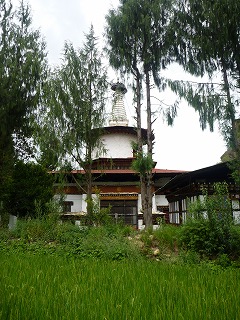 | ここのお寺の屋根はブータンの他のお寺では見られないとんがり帽子のような形になっているのが特徴だ。 | ![]() |