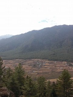 | ポプジカの平原は、ブータンの中では比較的広い方だ。鶴だけでなく遠くにヒマラヤ山脈も望め絶景だ。 | ![]() |