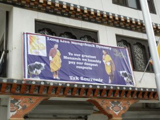 | 少し体調が回復したのと、食糧が底を付いたので久しぶりに外に出て街まで買い物へ。街中は至るところに国旗や国王の写真が飾りつけられていて、戴冠式のお祭りムード一色でした。 昼食はすこし栄養をつけようと、ドゥルックホテルのビジネスランチを食べました。今は観光シーズンなので食堂の場所が広い所に移動になってました。店員さんと軽く会話。やっぱり戴冠式中は全室満室だそうな。 |