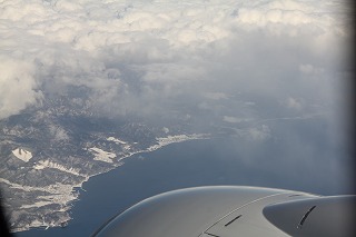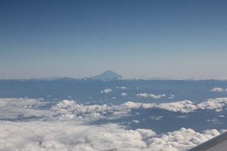 飛行機は順調に高度を上げやがて水平飛行に。遠くに富士山がくっきり見えたが、一月なのに殆ど雪が積もっていないようだ。 |