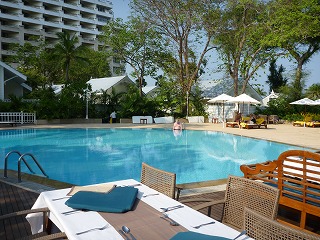 | 朝食はラウンジの屋内で食べることもできるのだが、こんな天気の良い日にはプールに面した外で食べるのが気持ちが良い。 | ![]() |
