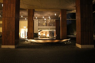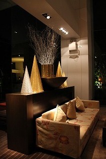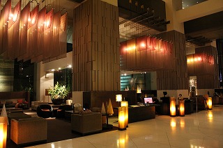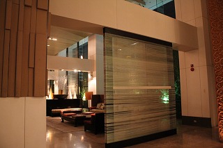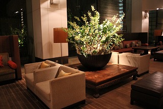 最後はロビー。吹き抜けの高い天井が特徴だ。天井からはクリスマスツリーが逆さに飾られていた。随所にこのホテルらしい変わったデザインのオブジェが散逸していて、見ているだけでおもしろい。 |