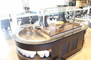 朝食会場はグランドキャッスル カフェ & ダイニング。ホットミールはプレートで出され、それ以外はブッフェ形式だ。取り分けの為のプラスチック手袋が配られた。 |