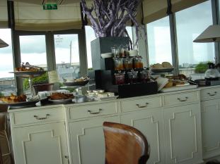 朝食は10階のラウンジで食べた。最上階にあるテラス風のラウンジは、窓が大きく明るくて開放的。あまり高層建築物がないアムステルダムの市街が一望でき、朝から気分が良い。 | |