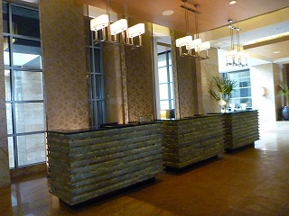 エントランスから少し階段を上るとフロントデスク。フロントデスクの近くだけ、外界からの光が入るようになっていて明るい。 |