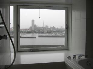 | バスルームからは外が眺められて気持ちが良い。なかなか快適な空間だが、窓の前にあるデッドスペースがもったいない。 | |