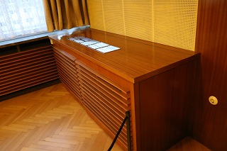 シュタージのトップ、エーリッヒ・ミールケの執務室(大臣室)。彼は1957年11月1日に大臣に就任し、「ハウス1」のこの部屋を1962年から1989年まで使用していた。ここでは公式訪問者を接待したり、シュタージの職員や重要なゲストと会議を行ったりしていた。1961年の完成以来この部屋はミールケの指示で何度も内装の変更が行われた。室内には複数の電話が設置されているが、東ドイツ政府の重要人物やソビエト連邦の要人と直通で話しができたらしい。 |