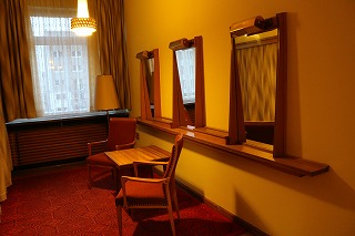 | 随分と豪華な休憩ホール。この隣に会議室がありその合間の休憩に使われたり、大臣がレセプションを開いたりするのに使用された。1960年代は女性用の休憩室も存在したが、結局東ドイツ崩壊までこのレベルに入れる地位に就いた女性がいなかったので、その場所はキッチンに改造された。この部屋のどこかに秘密のバックドアがあり、大臣やそのゲストは警備員や職員に気がつかれることなくここに出入りすることができた。 | ![]() |