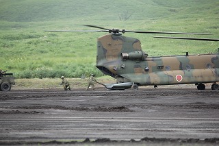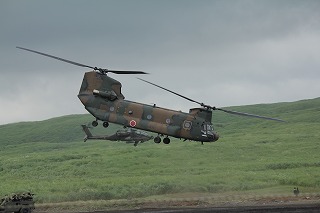 CH-47JAチヌーク。CH-47Dの日本仕向け用として国内でライセンス生産され大型輸送ヘリコプター。 |