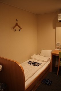 | 部屋は思ったよりも広い。狭いビジネスホテルの風呂・トイレ無し版といった感じ。サイズ的には昔のブルートレインのA寝台個室に似ている。 | ![]() |
