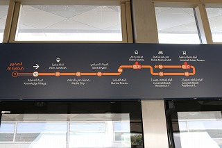 最初に乗車したKnowledge Village駅。なにか大きな施設の近くに駅があると言うよりは、なんとなく等間隔に駅が設置されている感じがする。路面電車と言ってもそこは暑いドバイ、ホームは空調完備の建物になっている。 |