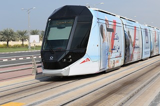 ドバイにはトラムもある。路面電車というよりは殆ど道路と平行した専用線を通る。列車のデザインは近未来的。殆どの車両が全面広告車だ。 |