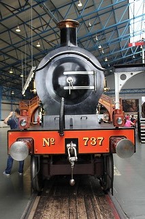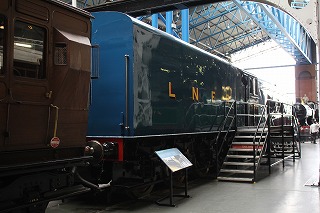 | 737号機に連結されている客車は1913年にバーミンガムで製造されロンドン・ヨーロッパパッセンジャーサービスで1961年まで使用されていたプルマン社の客車。プルマン社はアメリカの会社なので、イギリスに輸出され、当時は豪華な客車としてもてはやされた。ちなみに上に見える橋も展示物で、ノース・イースト鉄道の駅構内で使用されていた鉄製の歩道橋。 | ![]() |