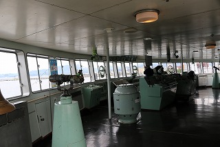 ブリッジ。当時の機器類がほぼそのままの状態で保存されている。実際の計器類やスイッチも触ることができる。 |