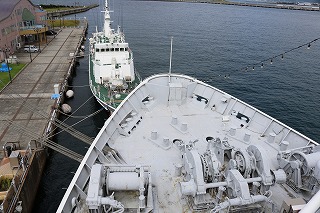外に出てみる。現役当時も長い船旅の息抜きにこの甲板を歩くことができた。 |